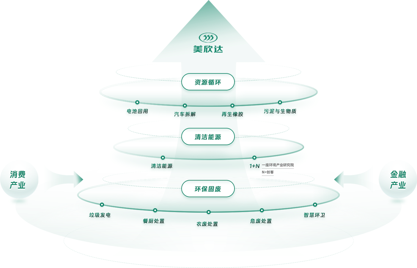 “一體” 是美欣達的主導產(chǎn)業(yè),“綠色低碳產(chǎn)業(yè)”分為三大產(chǎn)業(yè)板塊,即環(huán)保固廢產(chǎn)業(yè)、資源循環(huán)產(chǎn)業(yè)和清潔能源產(chǎn)業(yè)“三位一體”。環(huán)保固廢產(chǎn)業(yè),該產(chǎn)業(yè)板塊主要實現(xiàn)固廢的減量化、無害化協(xié)同處置,也是核心主導產(chǎn)業(yè)和“基本盤”。包括主板上市公司——主營生活垃圾焚燒發(fā)電業(yè)務的旺能環(huán)境,主營餐廚垃圾處置業(yè)務的旺能生態(tài),主營危廢處置業(yè)務的納海環(huán)境,主營垃圾收集運一體化的欣環(huán)衛(wèi),主營病死豬和農(nóng)廢處置業(yè)務的百奧邁斯。資源循環(huán)產(chǎn)業(yè),該產(chǎn)業(yè)板塊主要挖掘“城市礦山”,實現(xiàn)固廢的資源化綜合利用。包括主營鋰電池回收利用業(yè)務的浙江立鑫,主營廢鋼利用業(yè)務的湖州欣誠,主營橡膠再生利用的南通回力和南普科技,聚焦于污泥和生物質綜合處置和燃料開發(fā)的欣啟源等產(chǎn)業(yè)和項目。同時,也包括廢紡利用、飛灰資源化、餐廚垃圾生物蛋白質轉化、建筑垃圾資源化等在孵項目。清潔能源產(chǎn)業(yè),該產(chǎn)業(yè)板塊主要依托主營熱電聯(lián)產(chǎn)業(yè)務的欣旺能源,致力于探索、開拓天然氣分布式能源、光伏儲能、再生資源利用等多個符合國家能源轉型需求、商業(yè)模式趨于成熟的新業(yè)務、新模式的深耕與拓展。此外,還成立美欣達產(chǎn)業(yè)研究院,打造聚焦可持續(xù)低碳綠色發(fā)展的產(chǎn)業(yè)化創(chuàng)新創(chuàng)業(yè)“雙創(chuàng)”平臺,緊盯綠色低碳產(chǎn)業(yè)前沿,緊緊圍繞綠色產(chǎn)業(yè)鏈上下游,專注于低碳技術創(chuàng)新、綠色金融投資及孵化企業(yè)發(fā)展,在可持續(xù)發(fā)展咨詢、低碳創(chuàng)新技術支撐、海內外人才引進、創(chuàng)業(yè)孵化服務、綠色金融投資等體系建設上賦能助力。