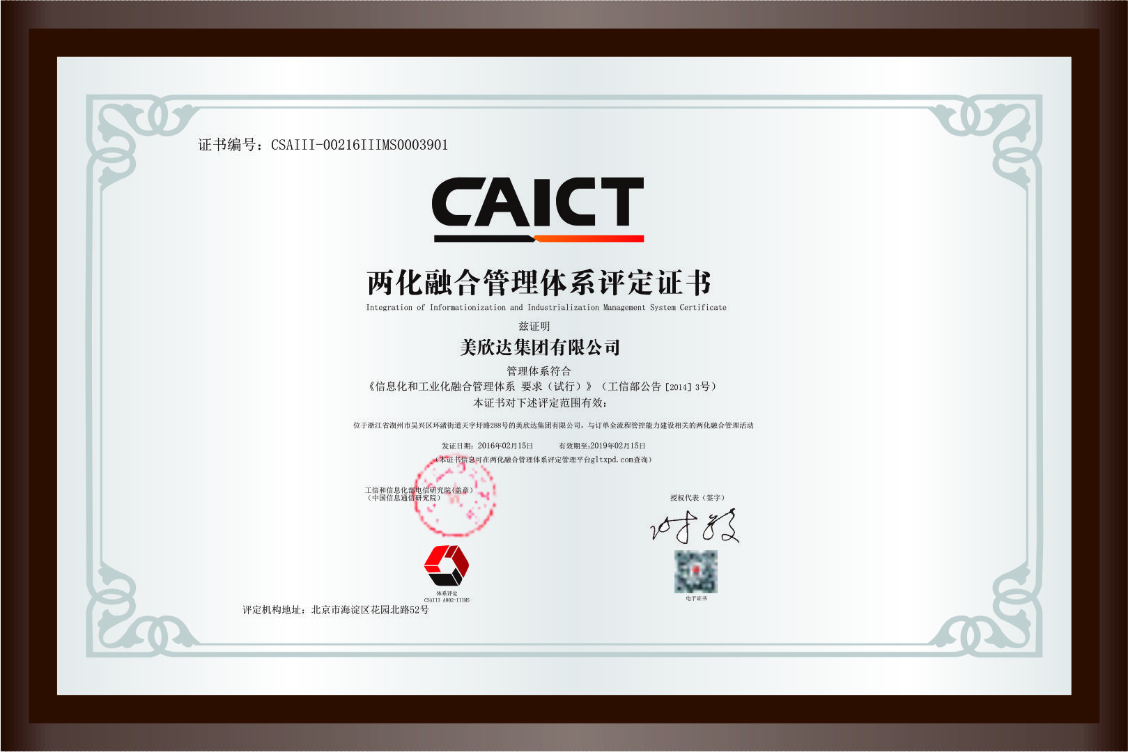 兩化融合管理體系評(píng)定證書